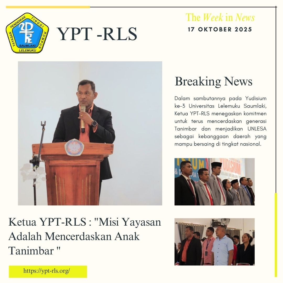 Saumlaki, 17 Oktober 2025 – Yudisium ke-3 Universitas Lelemuku Saumlaki (UNLESA) Tahun Akademik 2025/2026, berlangsung khidmat dan penuh semangat. Dalam kesempatan ini, Ketua Yayasan Pendidikan Tinggi Rempun Lelemuku Saumlaki (YPT-RLS) menyampaikan sambutan yang menggugah dan penuh makna bagi seluruh civitas akademika, terutama bagi para mahasiswa yang akan segera diwisuda.
